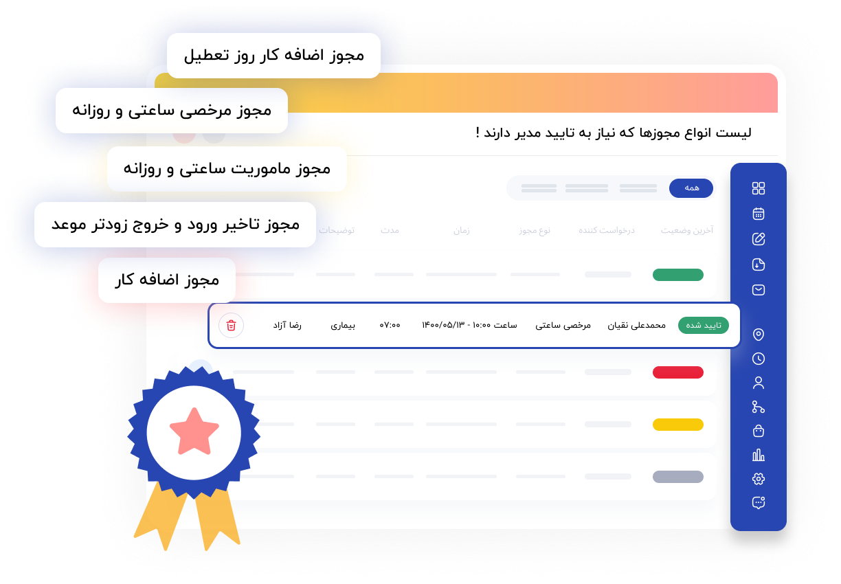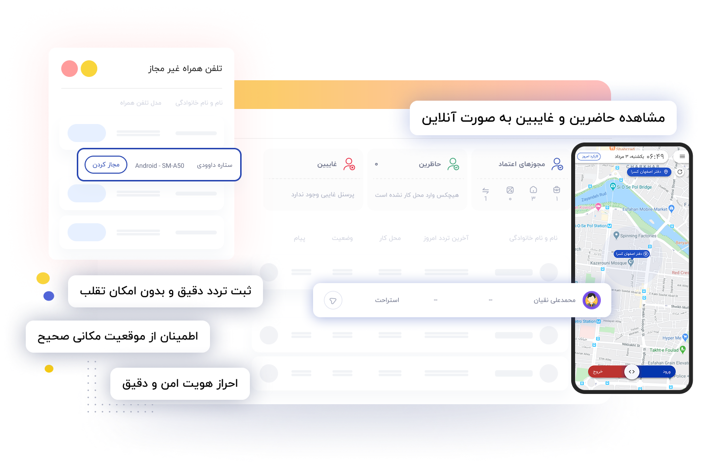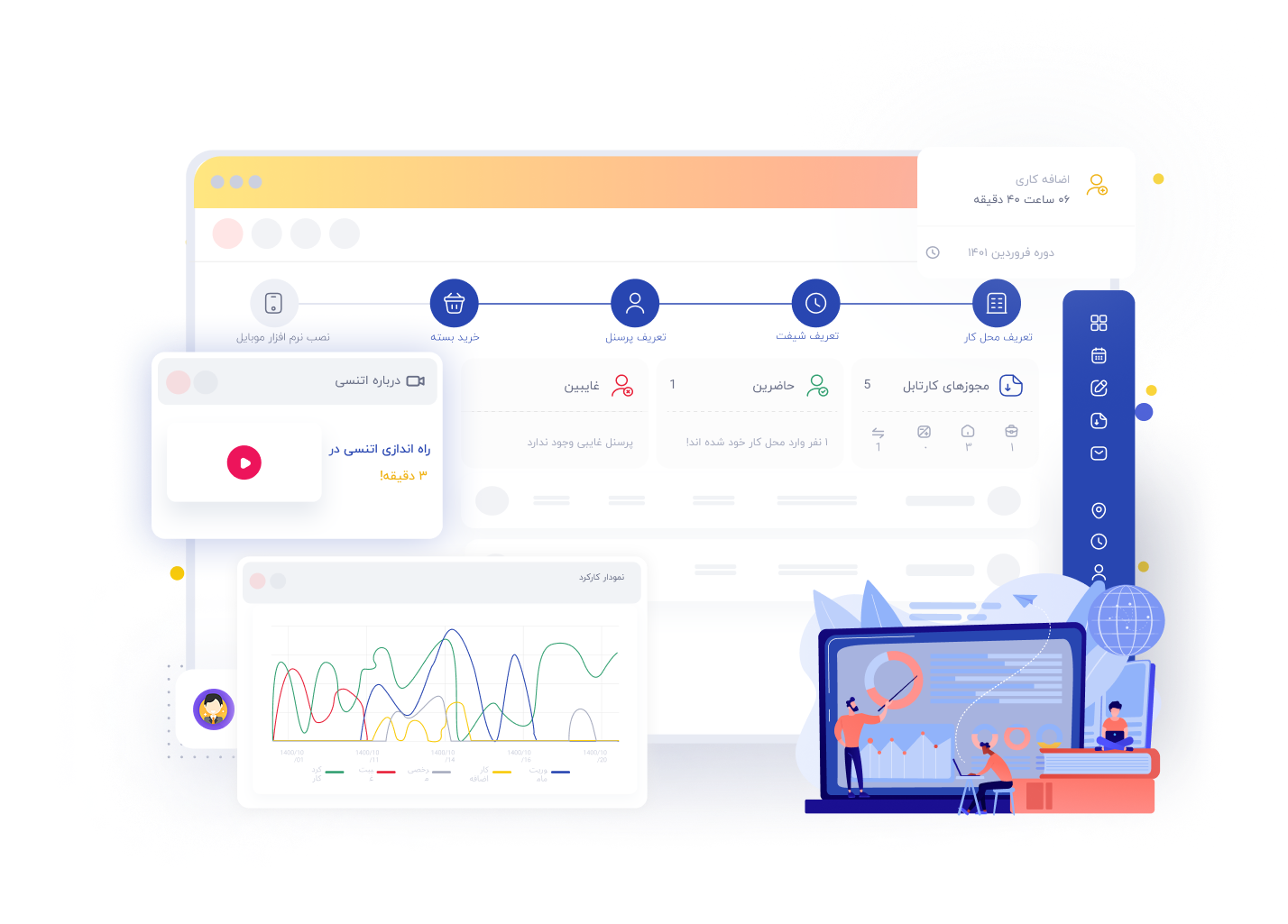 لە هەر ساتێکدا ئاگاداری دۆخی ئامادەبوون و کارکردنی کارمەندەکانتان بن. لیستی کەسە ئامادە و ئامادەنەبووەکان ببینن و داواکارییەکانی مۆڵەت یان ئەرکەکان ڕاستەوخۆ بپشکنن و پەسەندیان بکەن.